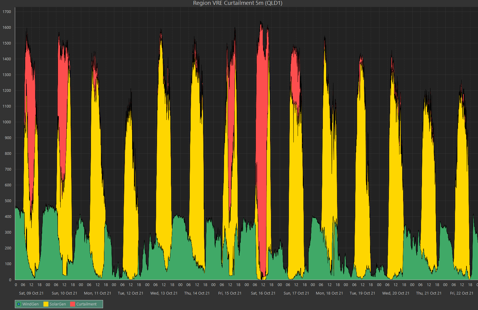 The 50% hurdle could have been higher as negative prices in South Australia economically constrained some large-scale solar plants. On the previous day, the record would have been broken if not for Queensland economically constraining off 1,800MW of large scale solar due to negative prices.