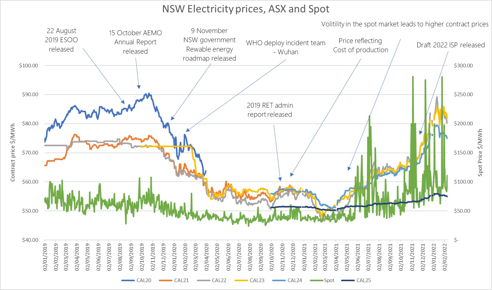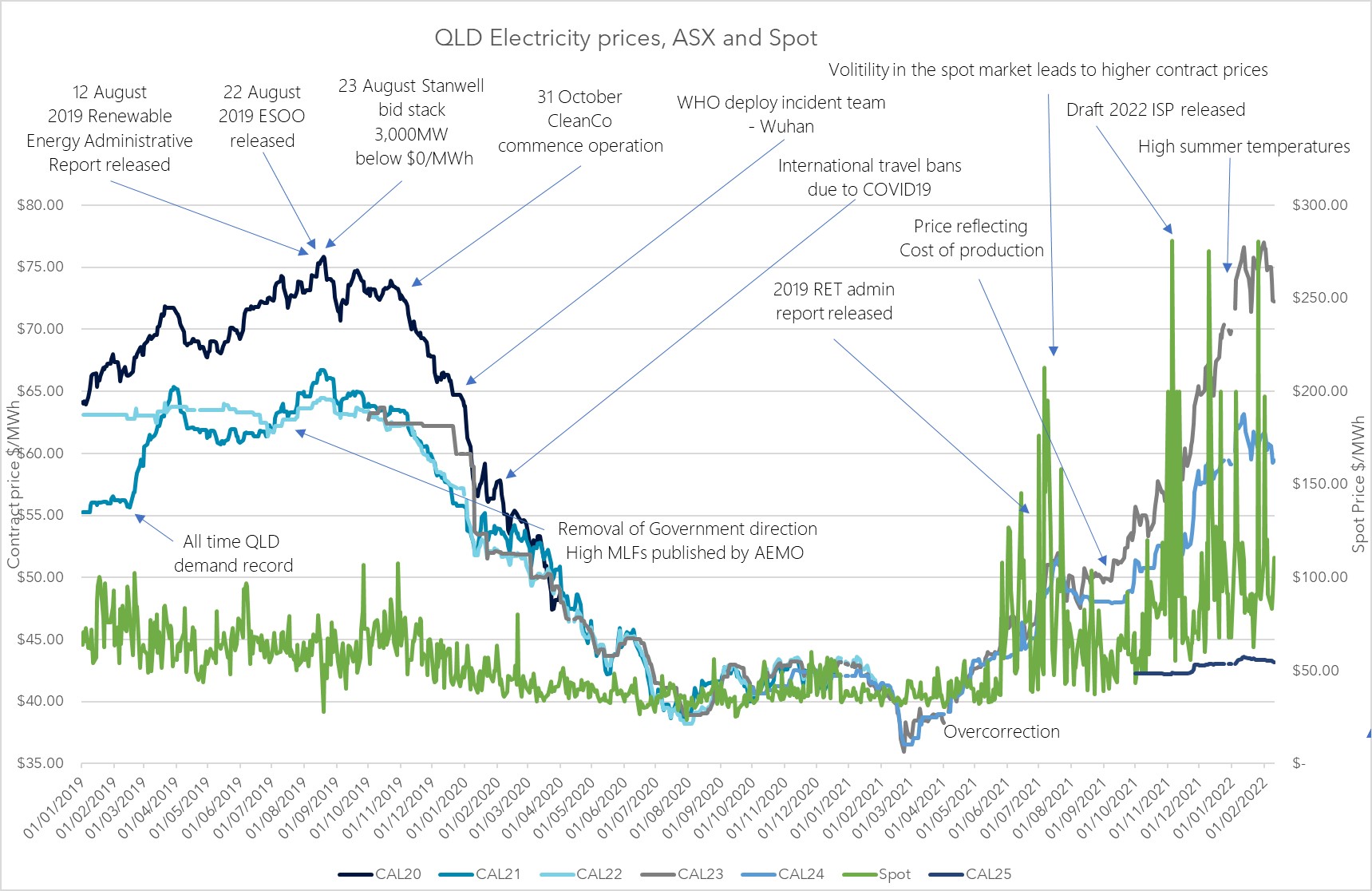 The chart below shows that the underlying spot price (light blue line) has continued to spike and trend up resulting in increases in the contract prices. Another interesting aspect of price curves is how market announcements such as the cost of coal and gas can impact the curve. In months, the curve softened but spiked due to conflicts in Ukraine causing coal and gas, a key input to thermal generation, to increase in price.